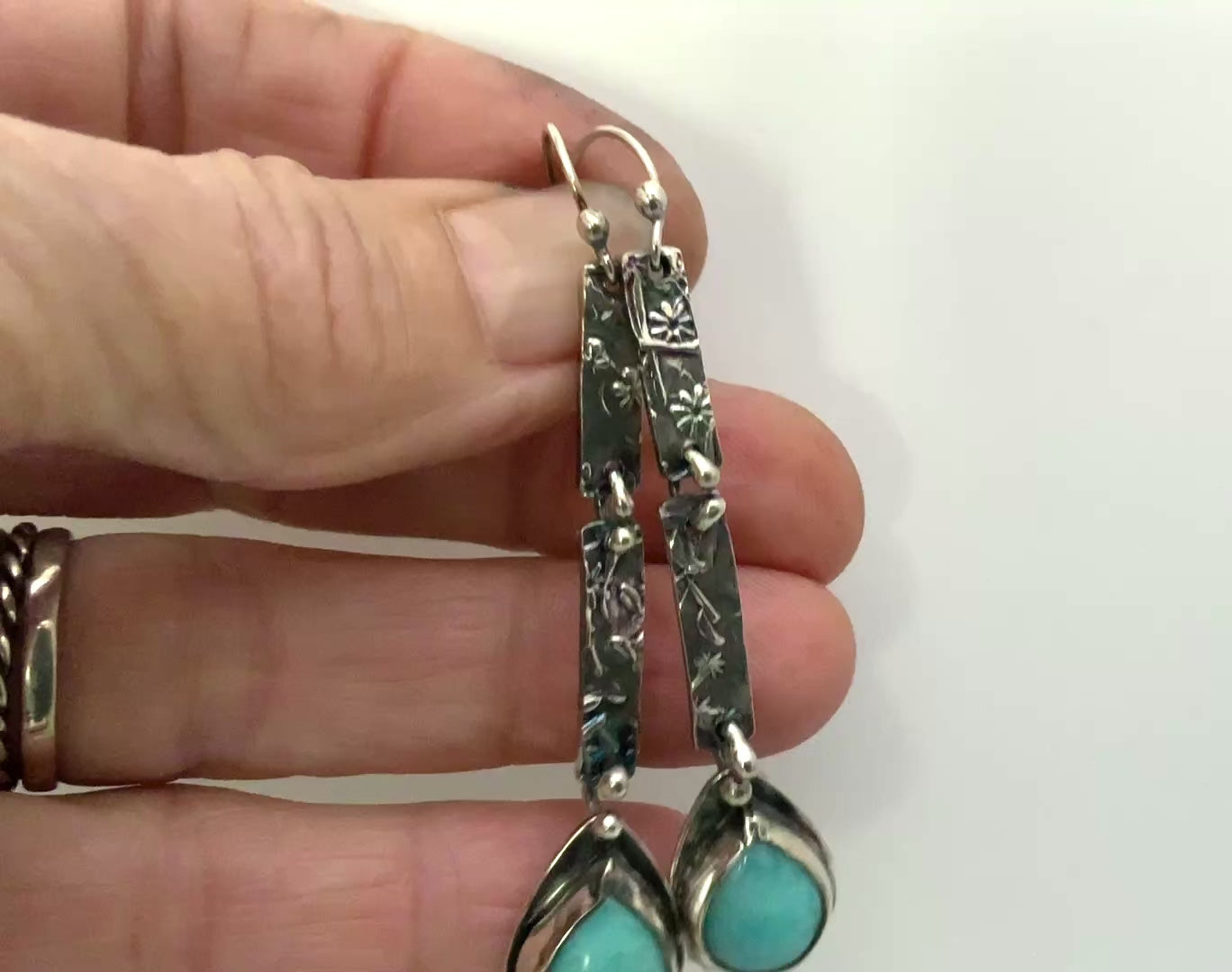 - Elegant teardrop earrings featuring natural Amazonite stones and hand-embossed sterling silver. A flattering dangly pair of earrings inspired by Appalachian textures and native plants.