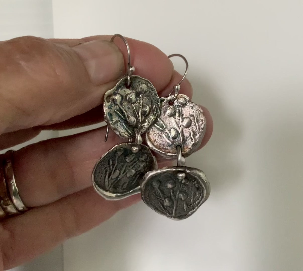Oh man. I'm such a firebug, and love to experiment with ways to make pattern in sterling silver! So I took a perfectly good little hammer and carved up the face of it to make a pattern I could press into a molten bit of silver. So explosions and splatters followed, then the moment that it worked! Practice and more practice and finally I got it down. So here is a pair of dangly, ancient looking earrings in a pretty soft antiqued silver look for a rustic, and clearly unique pair of earrings. I hope you love them as much as I do!