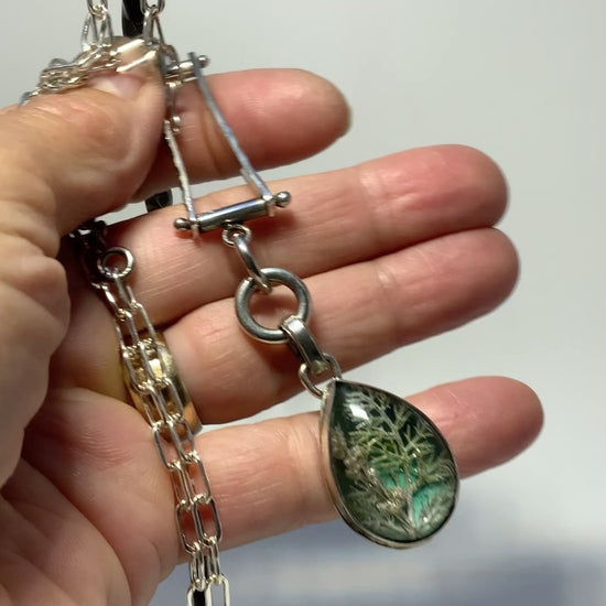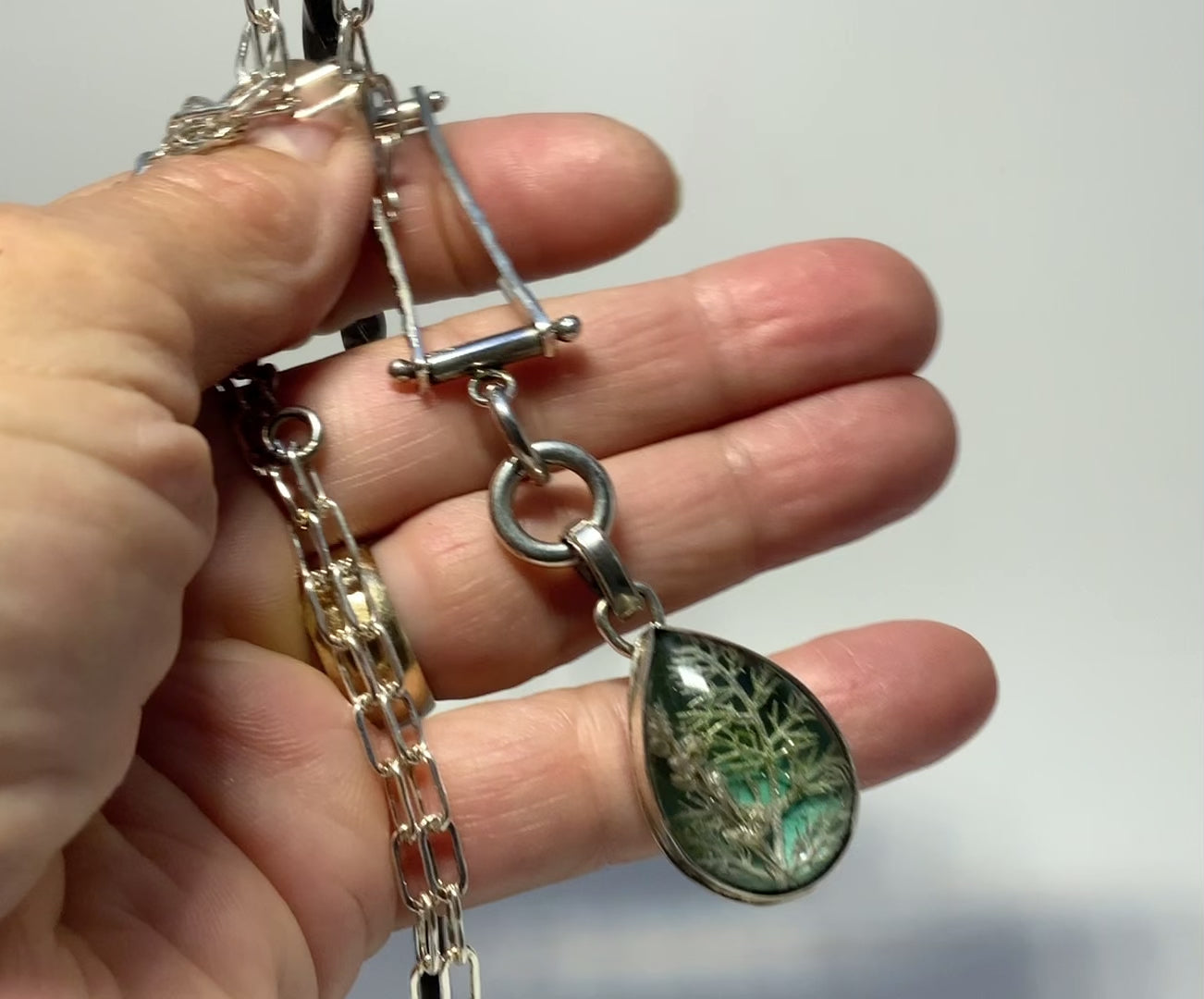 This one-of-a-kind sterling silver pendant holds delicate plant fragments — tiny flowers, sprigs of yarrow, and other botanicals, both native and non-native — preserved under a clear dome of resin.