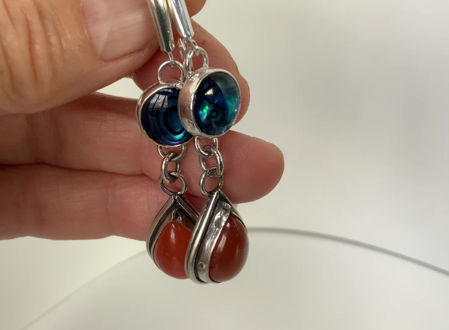 These carnelian teardrops! I love the graceful, face flattering shape of a teardrop earring, and these beautiful dollops of carnelian are set in a hand made setting with a frame surrounding the cabochon . I like the contrast of color with the bezel set Abalone segments for a bright little pop of color! And tucked away on the back is the wildflower pattern I like just for a pretty little private secret garden.