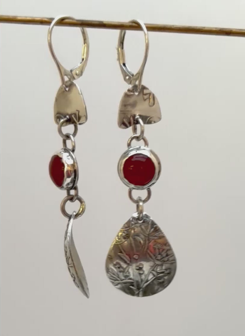 These handmade earrings pair warm carnelian cabochons with my hand-embossed wildflower pattern, inspired by native asters. The contrast of richly antiqued sterling silver against the deep orange stones creates a striking color combination, especially suited to autumn’s palette.
