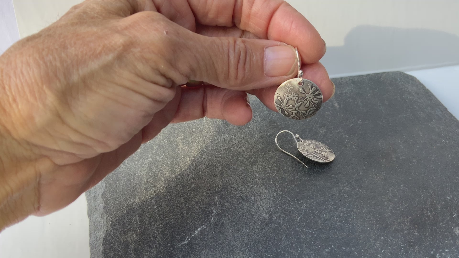 Simple and light, these nice lightweight earrings are the kind lots of ladies tell me they wear them every day! The discs are about dime sized and feature a nice deep embossed native flower theme pattern, I have antiqued and brushed back to a pretty satin grey finish.=f