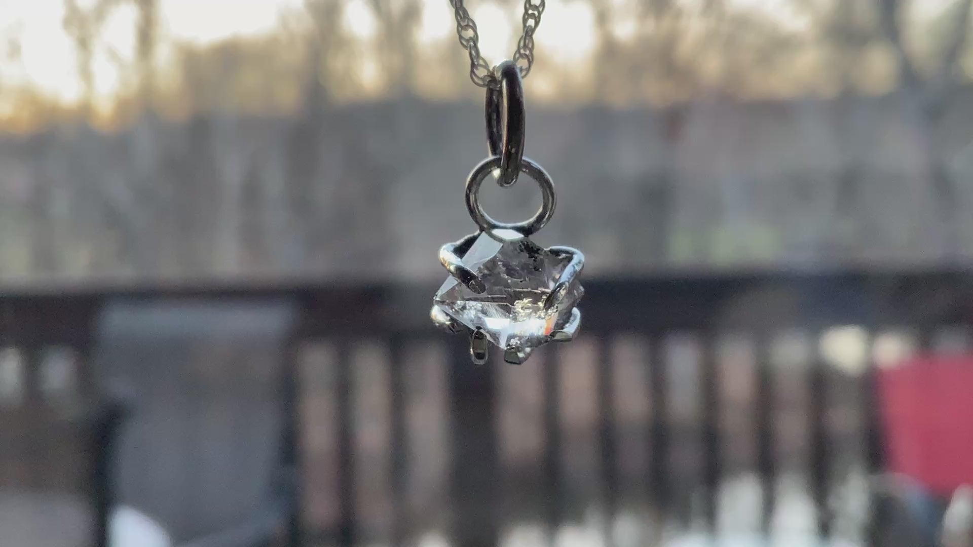 Get ready to shine with a Herkimer Diamond Necklace! Handcrafted with a sterling silver rustic prong setting, this necklace allows the light to pass through the unique double terminated gemstone. Adding a touch of whimsy, the inclusion formation inside the diamond is often referred to as a "phantom". Embrace your individuality and sparkle with this one-of-a-kind piece. Chain included 18”