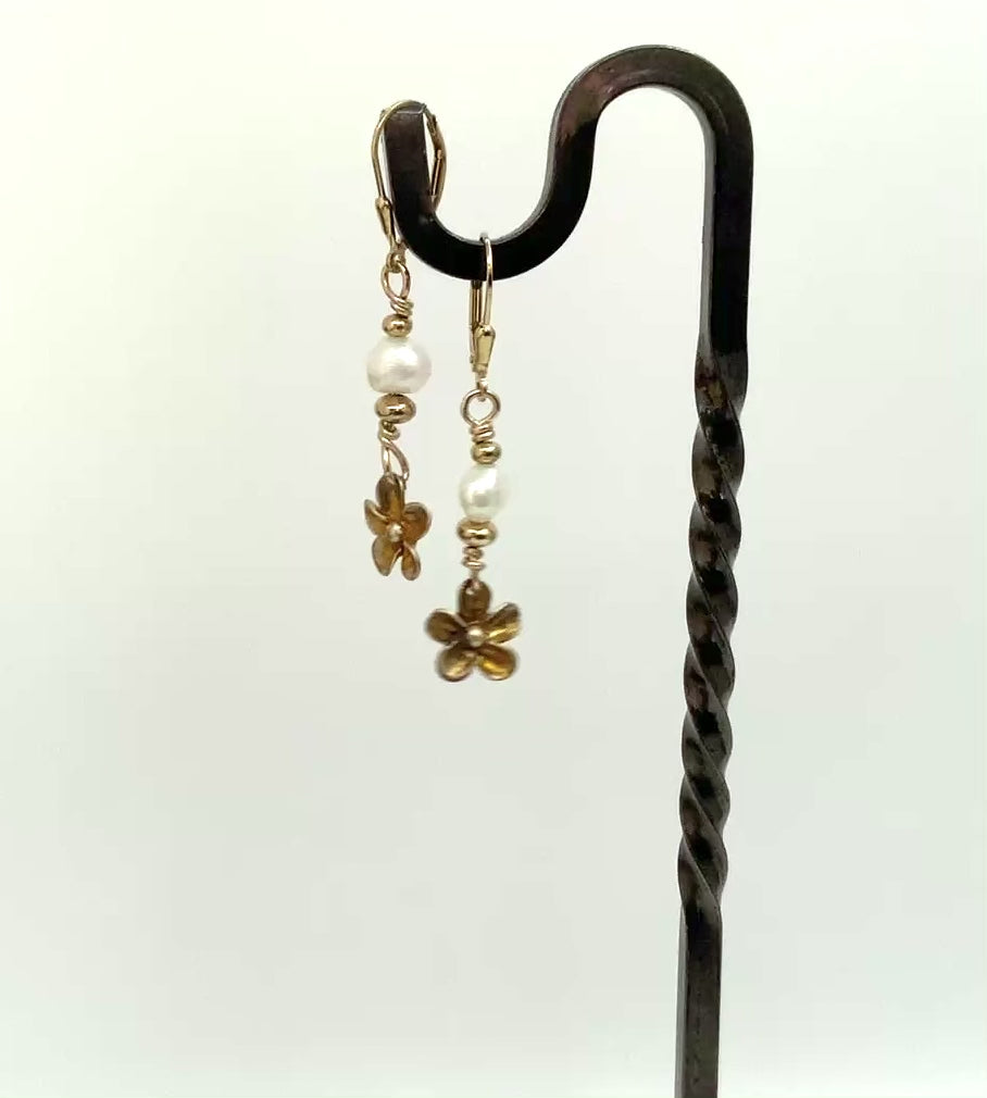 These earrings feature a beautiful combination of gold and pearls, giving them a simple yet bohemian feel. With brushed bronze flower designs and gold fill beads, they are both rustic and elegant. The lever back ear wires add a touch of sophistication and are perfect for the adventurous wearer.