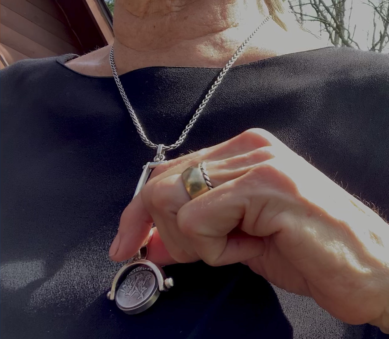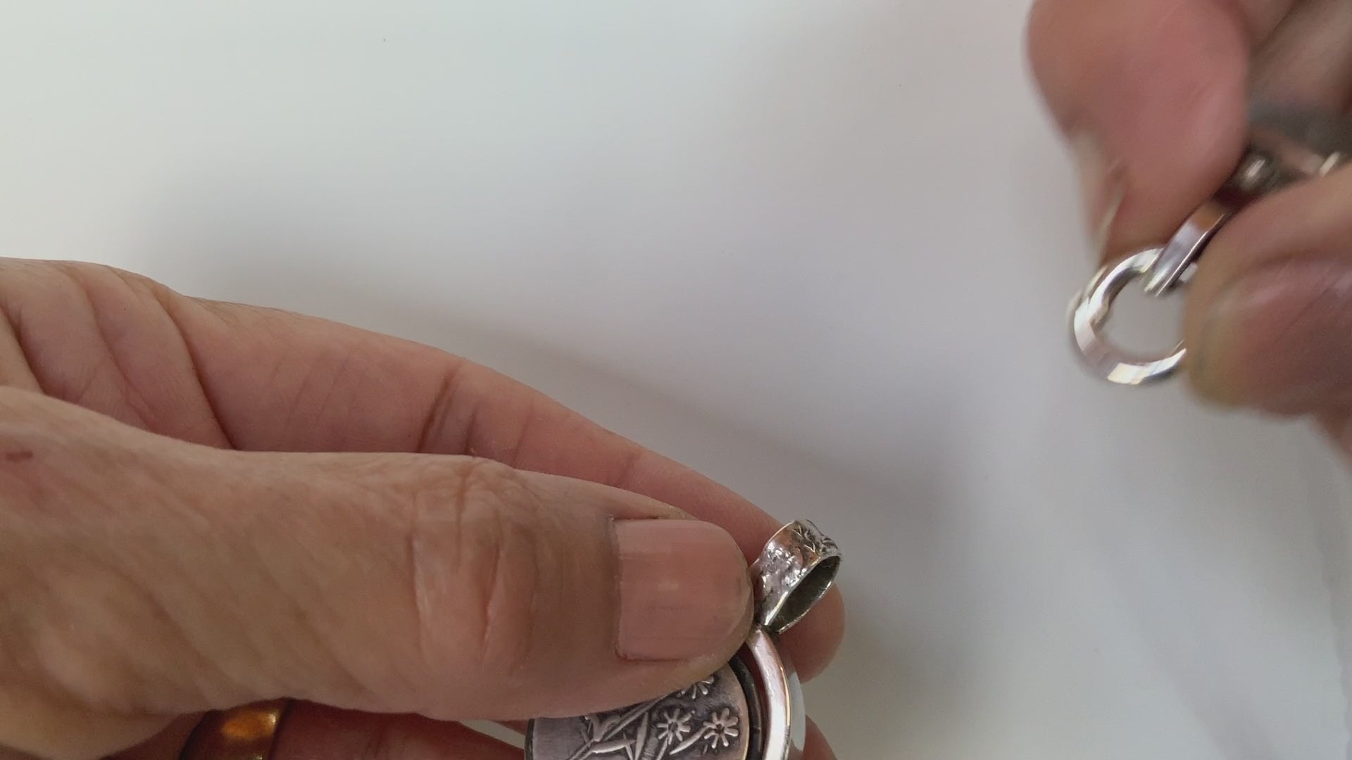 This reversible sterling pendant comes with a strong 20" chain and a versatile pendant holder, affectionately known as the trapeze. The perfect accessory for any outfit, the pendant can easily be changed to fit any style, while the strong chain ensures it stays securely in place.This reversible sterling pendant has three parts all working together for a versatile, personal and very interesting creation that will be uniquely yours!