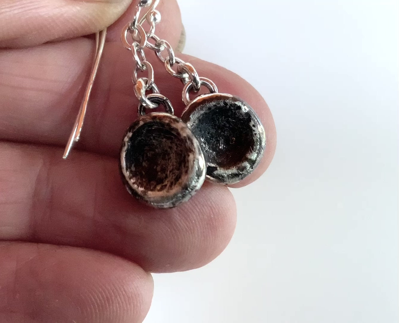 Recycled droplets of silver make these simple rustic earrings. I melted some sterling into molten droplets then pressed a metal rod into them while they were red hot to create this simple rustic shape. The length is very petite and the droplet is about the size of a “smartie”. If you know..you know!