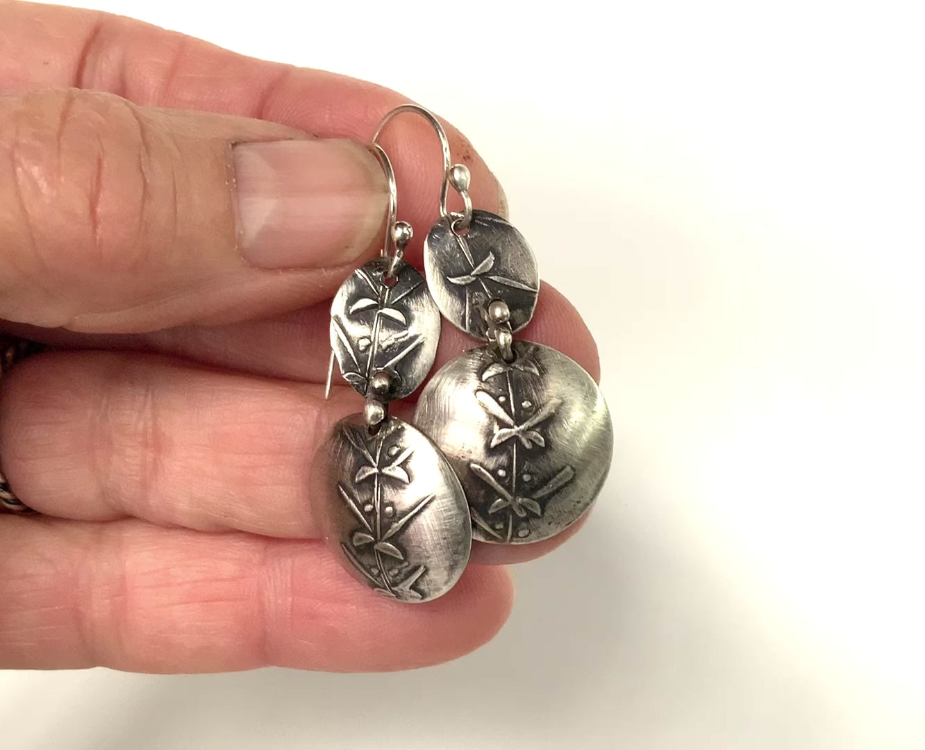These lightweight double-segment earrings feature an original pattern carved into brass and fused with silver, showcasing my unique, handcrafted technique.