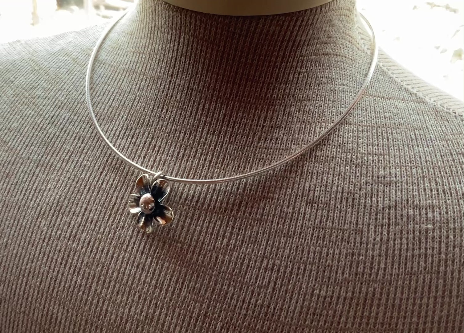 - Hand-forged, one-of-a-kind flower pendant combining sterling silver and bronze.