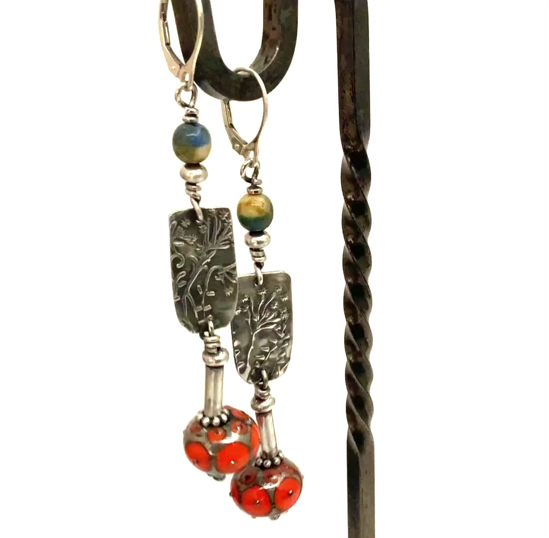 I created a representation of Queen Anne’s Lace and pressed that pattern into sterling silver for this pair of colorful earrings. Paired up with some beautiful hand blown lampwork beads, these are some joyful and colorful one-of-a-kind statement earrings! These measure 3 inches from the tops of the leverbacks to the bottoms, for a bolder look! (The leverbacks tend to stay on better as well if you’re a wild child….)